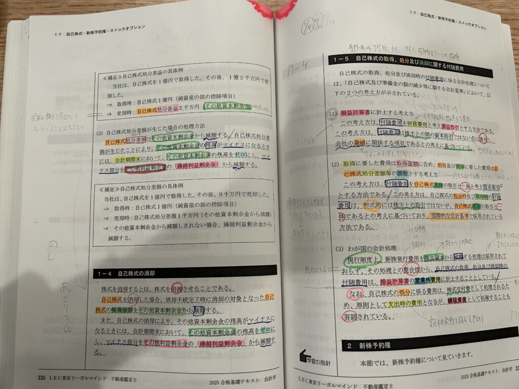 - 「自分の言葉」でのメモ: 例えば自己株式なら「自己株式を売却してもうけることはできない」といった、本質を突いたメモを余白に記入。仕組みを理解してから定義の暗記に入ると、驚くほど「するする」と脳に刻まれていきました。